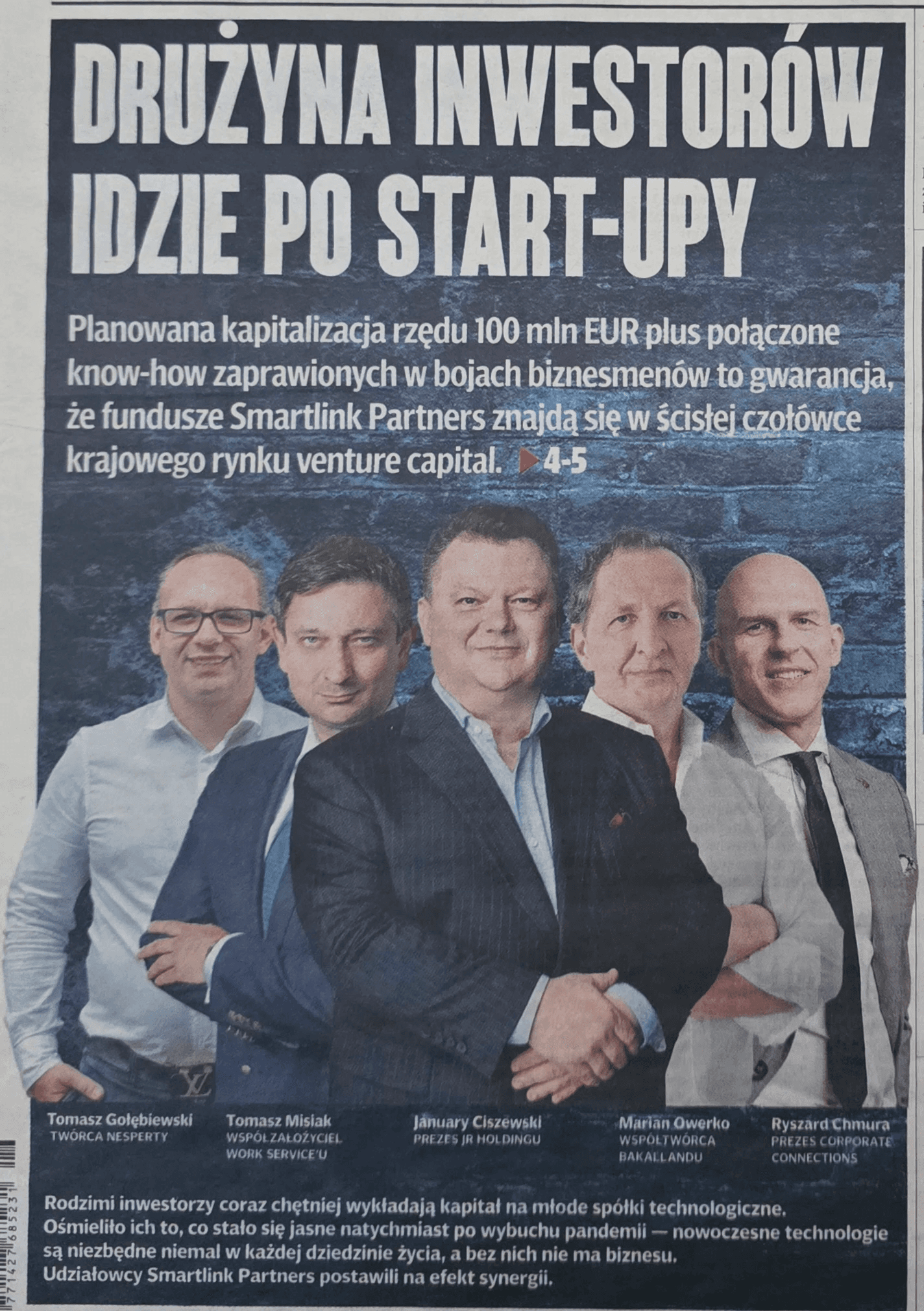 For many years, the Polish venture capital (VC) market was financed mainly through public programs. Private investors, if they decided to transact involving technology companies at all—which are very risky from an investor's point of view—did so very cautiously, committing relatively small amounts. It is only in the last three years, as the total value of VC investments in domestic start-ups exceeded PLN 1 billion, that investor enthusiasm has grown. Every now and then, a group of experienced managers or entrepreneurs announces the creation of a fund. Smartlink Partners, another such venture, will be one of the largest in the country if plans are successfully realized.